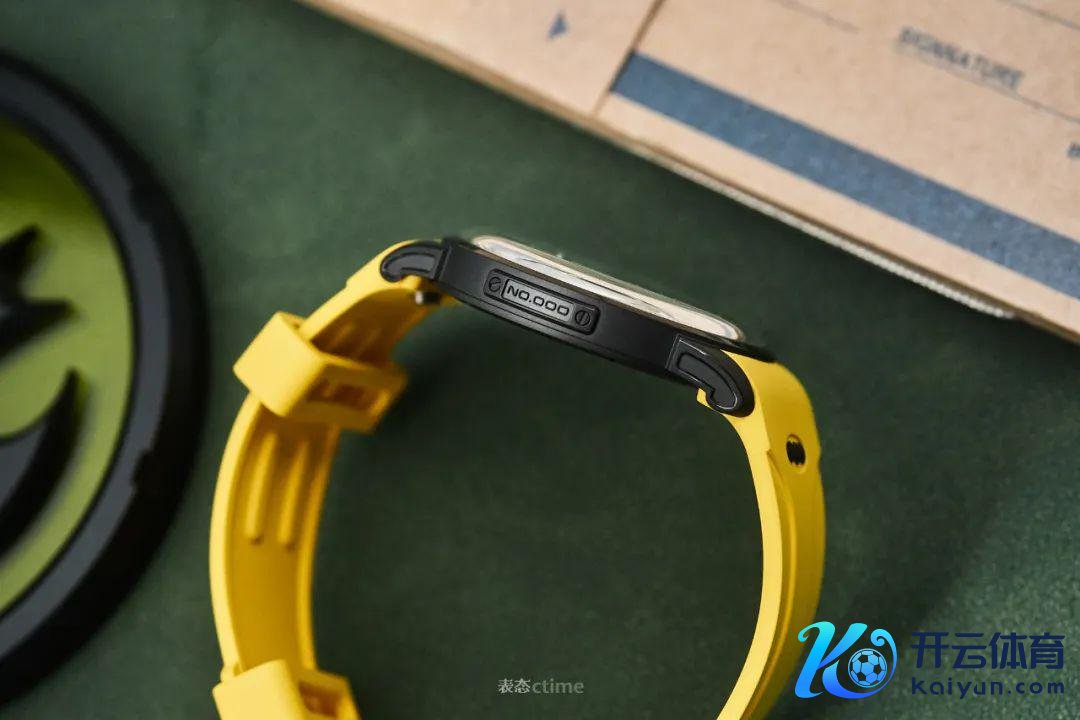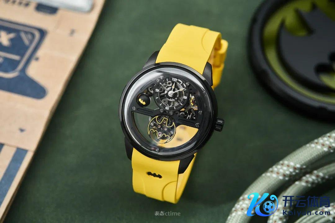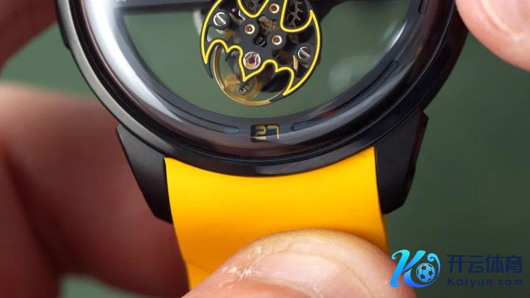 蝙蝠侠在夜晚出没比拟多,是以夜光一定有啊,陀飞轮和表盘上都有夜光填充。这块表配备玄色和黄色的橡胶表带各一条,我更心爱黄色少量。