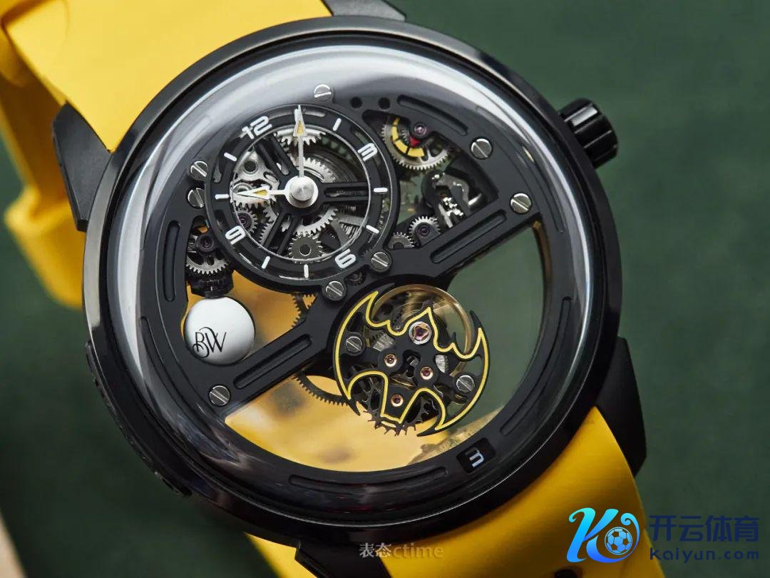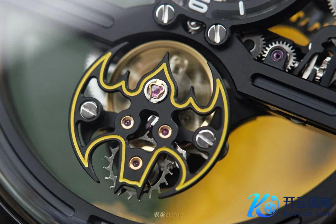 这块手表的主题至极明确,蝙蝠侠嘛,斗大一个,凯旋就放在陀飞轮上。“黝黑骑士”获得了DC的授权,为了庆祝蝙蝠侠出身85周年而稀薄推出,是以它其实是三方联名:贝伦斯、专注于陀飞轮的万希泉,以及DC漫画的东家华纳伯仲探索,这是大前提。