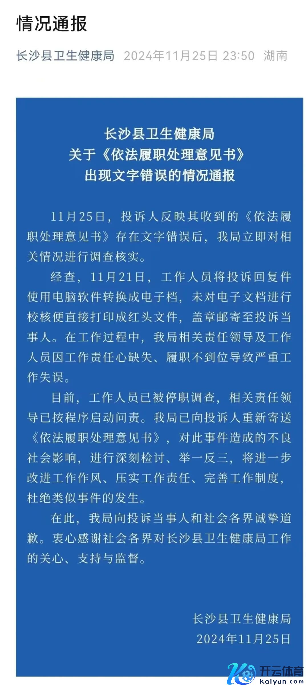 25日,长沙县卫生健康局发布情况通报称,经查,11月21日,责任主说念主员将投诉回答件使用电脑软件养息成电子档,未对电子文档进行校核便径直打印成红头文献,盖印邮寄至投诉当事东说念主。在责任流程中,该局联系遭殃指引及责任主说念主员因责任遭殃心缺失、履职不到位导致严重责任作假。