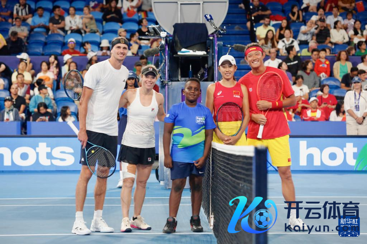 12月30日,中国队组合张之臻(右一)/张帅(右二)与德国队组合兹维列夫(左一)/西格蒙德(左二)在混双比赛前合影。